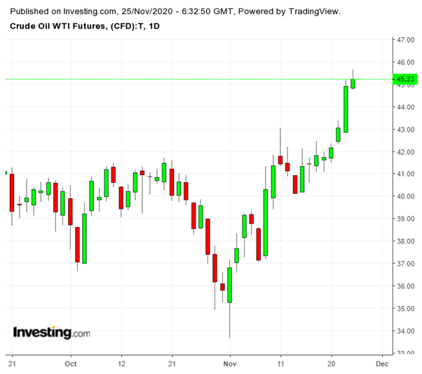 1. Tin tức về vắc-xin Coronavirus: Giá dầu giao sau hiện đang tăng, dựa trên tin tức tích cực rằng một hoặc nhiều vắc-xin coronavirus có thể được phổ biến rộng rãi vào cuối quý 1 năm 2021 và điều này sẽ cho phép quay trở lại việc sử dụng dầu và các biểu đồ du lịch như trước coronavirus.2. Nhu cầu từ người mua khu vực châu Á: Tâm lý tích cực đang được thúc đẩy bởi nhu cầu mới từ người mua ở khu vực châu Á, khi Trung Quốc gần đây đã ban hành một vòng hạn ngạch xuất khẩu nhiên liệu tinh chế mới cho những ngày còn lại của năm 2020.