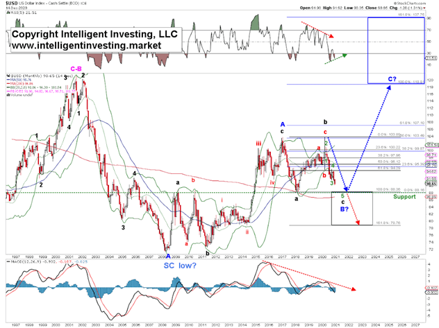 Cuối cùng, điều bất ngờ có thể là đồng bạc xanh toàn năng. Có vẻ như nó không nằm trong tầm ngắm của nhiều nhà giao dịch và nhà đầu tư, do đó, nó là một giao dịch dài hạn tuyệt vời. Tuy nhiên, nếu nó có thể giữ vùng 88 đô la vào đầu năm tới (tháng 1 đến tháng 3) trên cơ sở đóng cửa hàng tháng, để hoàn thành (màu xanh lá cây) sóng-5, nó sẽ có thể tăng trở lại 98-100 đô la trong suốt năm 2021, có khả năng cao hơn nhiều vào những năm tiếp theo (mũi tên màu xanh). Nhưng đó là câu chuyện cho thời gian khác. Nếu 88 đô la không được giữ, tôi không mong đợi mức đáy cho đến khi đạt tới 78 đô la.