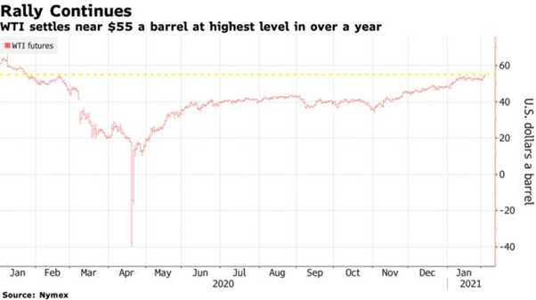 Hợp đồng tương lai tăng 2,3% tại New York lên mức cao nhất trong hơn một năm, tăng trở lại trên 55 USD/thùng trong giao dịch thanh toán sau, sau khi một số tập đoàn công nghiệp báo cáo một đợt sụt giảm khác trong kho dự trữ của Hoa Kỳ. Dầu thô đã tăng đều đặn kể từ cuối năm ngoái khi vắc xin coronavirus và nguồn cung của các nhà sản xuất hạn chế làm tăng kỳ vọng về một thị trường thắt chặt hơn. OPEC và các liên minh dự kiến sẽ rút bớt lượng dầu dư thừa vào giữa năm nay.