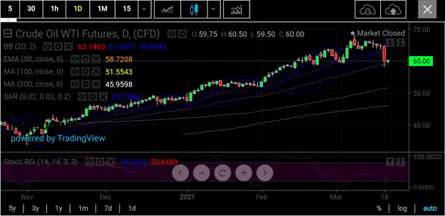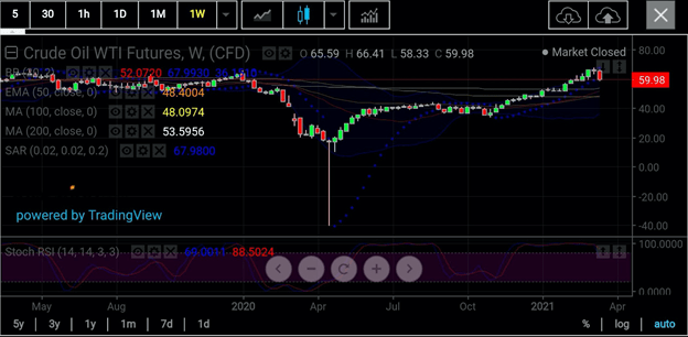 WTI giao dịch tại New York, vào thời điểm đó, đã từ từ tăng lên 38 đô la / thùng từ mức âm 40 đô la trong lịch sử vào tháng 4 (năm 2020), đã chứng kiến mức tăng đáng kinh ngạc trong tháng 1 từ việc cắt giảm sản lượng bất ngờ của OPEC + khiến giá của nó lên trên 50 đô la lần đầu tiên trong gần một năm.